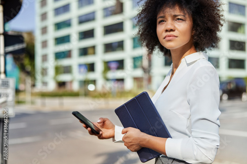 city, street, woman, business, outdoors, doing business, looking away, businesswoman, closeup, affectionate, tied-up, technology, cyberspace, one person, female, copy space, day, social issue, wireless technology, tablet, phone, car, building, horizontal