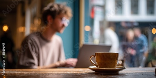 Busy cafe scene with a person working on a laptop and a coffee cup in focus during the afternoon
