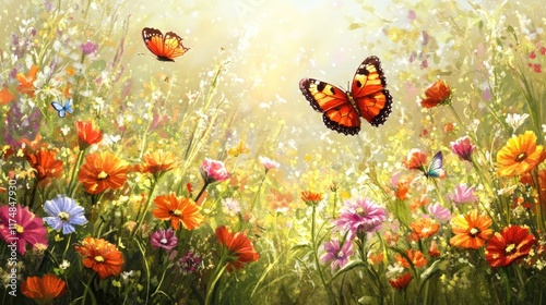 butterfly, wildflower, flower, meadow, summer, sunshine, orange, red, pink, purple, blue, green, yellow, field, blossom, flower petals, leaf, stem, nature, beauty, vibrant, colourful, bright, cheerful, delicate, wing, insect, flora, fauna, garden, landscape, art, painting, artwork, image, illustration, digital, graphic, design