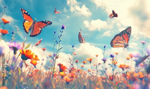Butterflies fluttering over a blooming field, springtime beauty 4K hyperrealistic photo.
