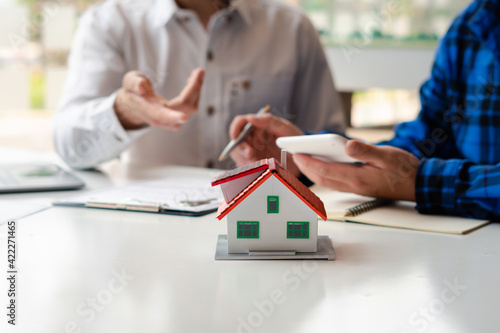Buying a Home or Insurance, an insurance agent explains the lease agreement to a client before making a contract. Mortgage loan approval home loan and insurance concept.