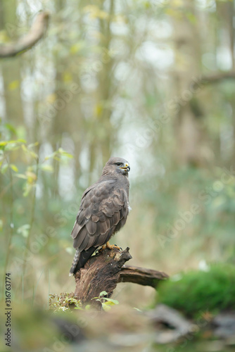 Buzzard sits on tree stump in forest. Side view.