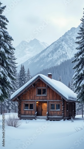 Cabin in the woods with a snow covered roof. The cabin is surrounded by trees and mountains