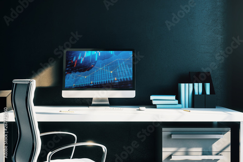 Cabinet desktop interior with financial charts and graphs on computer screen. Concept of stock market analysis and trading. 3d rendering.