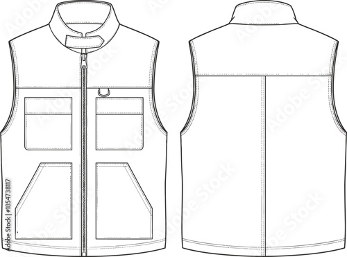 cad drawing flat vector illustration, sleeveless utility vest front back view, fashion technical sketch, garment design template, apparel CAD