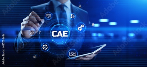 CAE Computer-aided engineering software system concept. Businessman pressing button on screen.