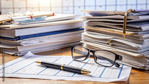 Calculated paperwork, pen, and glasses on a cluttered desk surrounded by folders, receipts, and a calendar, highlighting the complexity of filing taxes for the new year.
