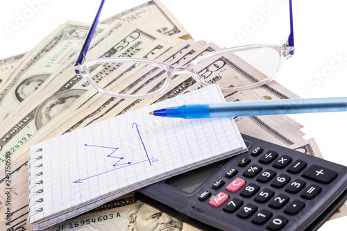 calculator and notebook on dollars isolated over white