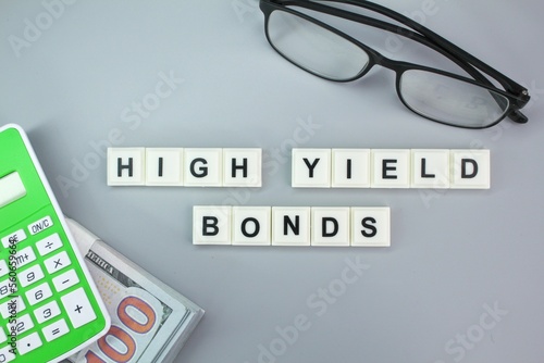 calculator, glasses and paper money with the alphabet word High-Yield Bonds.