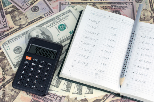 calculator green notebook with dollar bills on the background of money pension scheme concept
