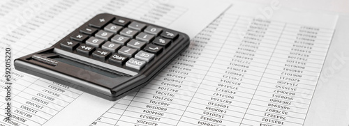 Calculator on financial statement and balance sheeet on desk of auditor. Concept of accounting and audit business.