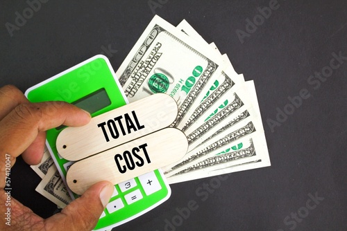 calculator, paper money and word total cost. the concept of overall cost or total cost