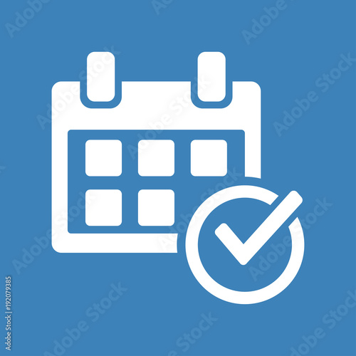 Calendar and check mark, white icon on blue background. Vector illustration