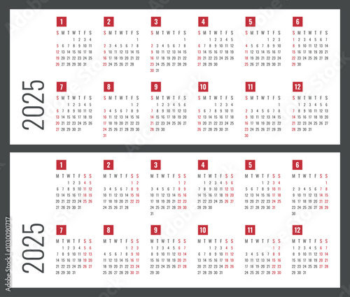 calendar for 2025 starts sunday and monday, vector calendar design 2025 year