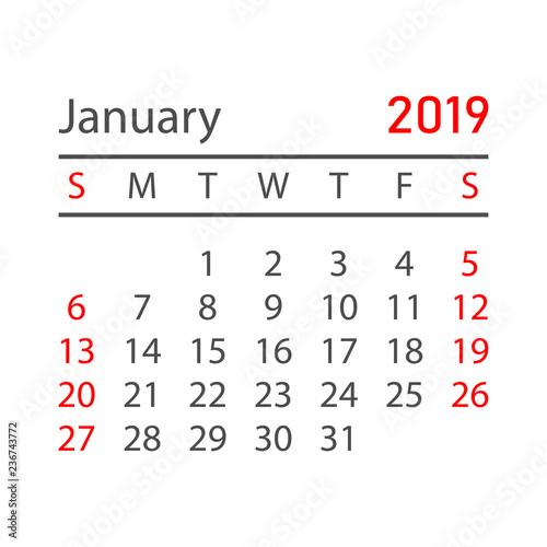 Calendar january 2019 year in simple style. Calendar planner design template. Agenda january monthly reminder. Business vector illustration.