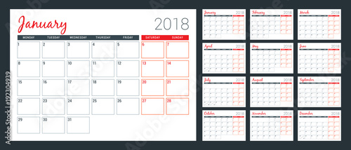 Calendar planner for 2018 year. Week starts on Monday. Vector design print template