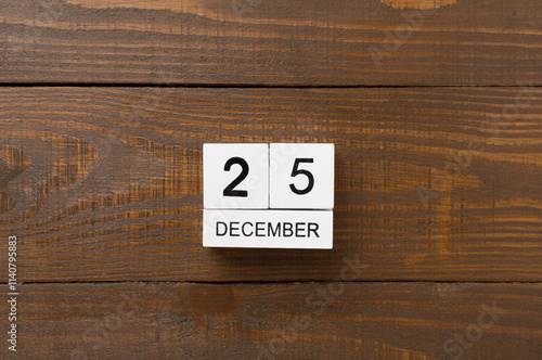 Calendar with date December 25 on wooden background, top view