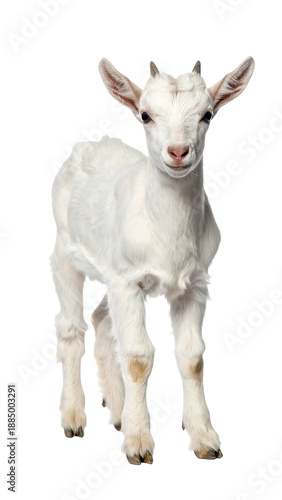 baby, goat, standing, calm, gentle, posture, white, background, isolated, animal, young, cute, domestic, serene, playful, innocence, farm, creature, wildlife, nature, mammal, hoofed, farmyard, portrait, front, baby animal, pet, furry, personality, small, expression, friendly, eye, ear, leg, coat, environment, appearance, motion, still, head, offspring, happiness, joy, peaceful, youth, tenderness