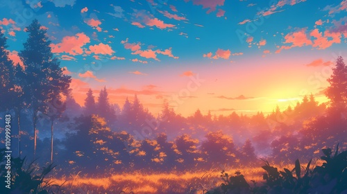 calm, forest, clearing, sunset, peaceful, anime, illustration