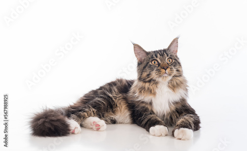 Calm Gray Maine Coon Cat Lying on White Desk with Reflection. White Background. Looking Up