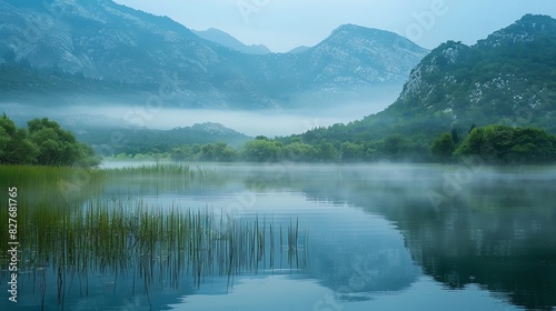Calm lake with misty mountains.
