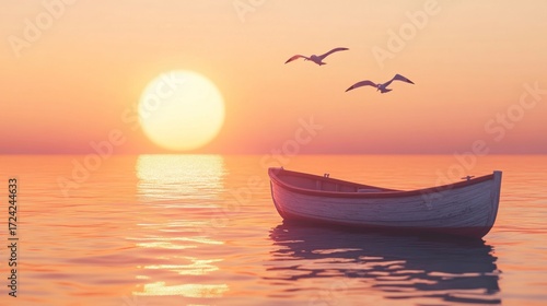 sunset, ocean, boat, seagull, calm, peaceful, tranquil, gold, orange, pink, sunrise, water, sky, horizon, nature, serene, idylli, beautiful, quiet, solitude, freedom, empty, floating, still, light, vibrant, warm, colours, dreamlike, three-dimensional, rendered, digital, art, illustration, seascape, bird, view, sun