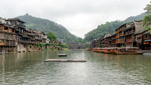 river, bridge, phoenix, boat, traditional, serene, calm, cultural, water, bank, background, landmark, travel, scenic, view, nature, tour tourism, architecture, old, historic, asian, landscape, village, green, mountain, wooden, china, peaceful, heritage, exploration, sightseeing, picturesque, harmony, environment, journey, culture, calmness, adventure, destination, ethnic
