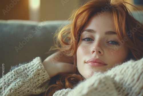 calm young woman relaxing on sofa at home in weekend, Generative AI