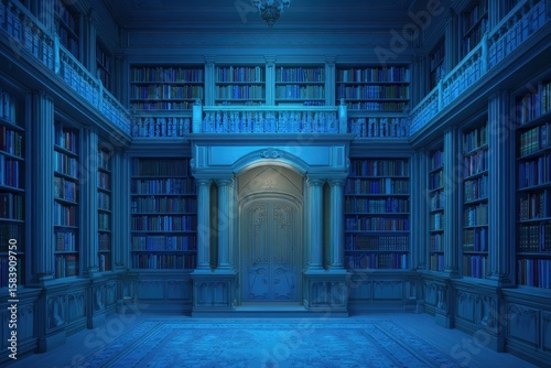Calming Blue Library Space: A Cozy Room Filled with Books and Shelves, Ideal for Learning and Intellectual Growth