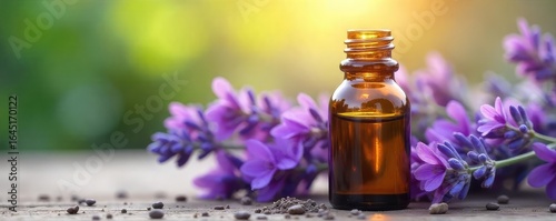 Calming Lavender Essential Oil Close-up of a bottle and fresh flowers, evoking serenity and wellness. Ideal for aromatherapy, spa, and beauty content.