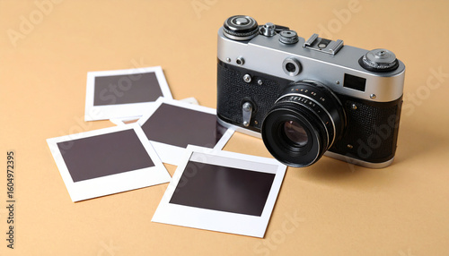 Camera and instant prints on beige surface, photography hobby