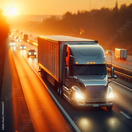 Camión atravesando la carretera, la luz de la puesta de sol se refleja en la carretera y en los vehículos, con un bonito paisaje de arboles y naturaleza por detrás