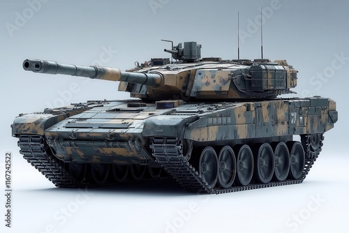 camouflaged battle tank positioned against a clean white backdrop showcasing its military design and tactical features in a striking isolated presentation