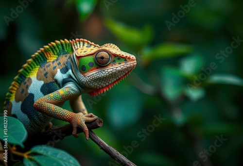 Camouflaged chameleon poised to strike, blurred foliage background, leaves, africa