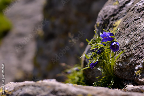 Campanula alpina plant in blooming period. Purple flower grown among the rocks of the high mountains