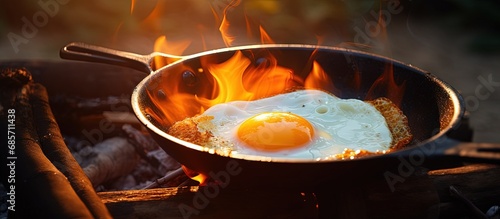 Campfire cooked fried egg in pan Copy space image Place for adding text or design