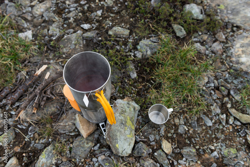 Campfire on mountain with tea container at dawn in summer outdoor.