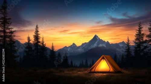 Camping adventure in the mountains sunrise glow scenic landscape outdoor serenity nature photography