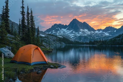 Camping Amidst Majestic Peaks: An inviting tent nestles beside a serene lake, framed by towering mountains and a sky ablaze with the hues of dawn, capturing the spirit of adventure and tranquility.