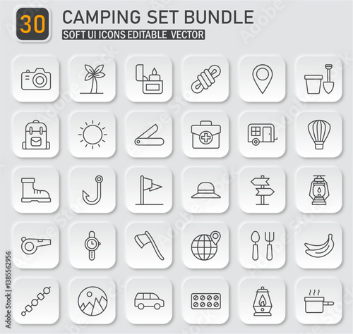 camping, adventure, icon, set, vector, collection, equipment, travel, nature, hiking, backpacking, recreation, activity, gear, wilderness, vacation, tour tourism, trip, explore, camera, palm, lighter, rope, location, bucket, shovel, backpack, sun, knife, first aid, trailer, balloon, boot, hook, flag, hat, signpost, lantern, whistle, watch, axe, globe, cutlery, banana, skewer, mountain, bus, tablet