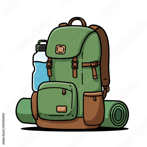 Camping backpack with water bottle and rolled mat for adventure