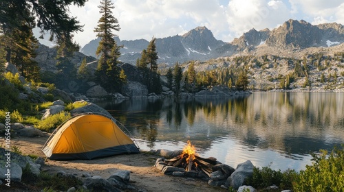 camping, lake, mountain, tent, fire, nature, outdoors, adventure, travel, landscape, water, tree, sky, forest, rock, campground, hiking, backpacking, wild, serenity, calm, peaceful, calmness, beautiful, scenic, summer, day, blue, green, yellow, brown, white, sunrise, sunset, wide, angle, panorama, photo, photo