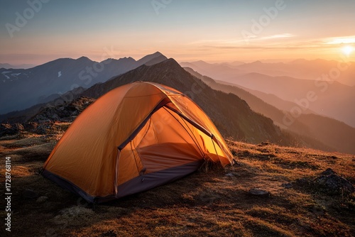 Camping tent at mountain sunset