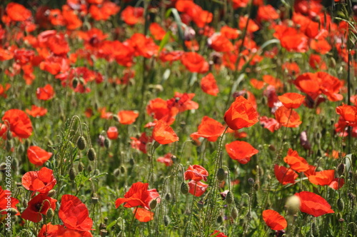 field, poppy, flower, red, meadow, summer, nature, spring, green, plant, bloom, garden, beauty, grass, countryside, stark, colours, orange, sun, beautiful, flora