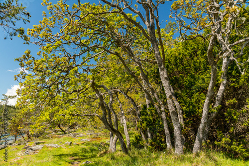 Canada, BC, Saltspring Island, Ruckle Park. Gnarled gary oak (Quercus garryana) trees on the shore of the Strait of Georgia.