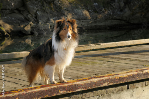 Canada, British Columbia, Gulf Islands, Wallace Island. Sheltie standing on the wharf in Conover Cove