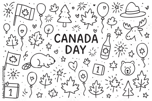 Canada day celebration doodles: flags, maple leaves, balloons, and beavers. Vector doodle illustration