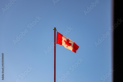 Canada Flag flagging in a withstand with blue sky in the background