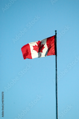 Canadian flag flying high in the sky outdoors.