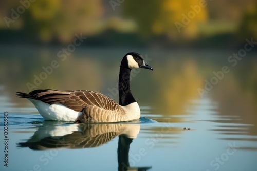Canadian geese glide on calm water, necks arched , waterfowl, water